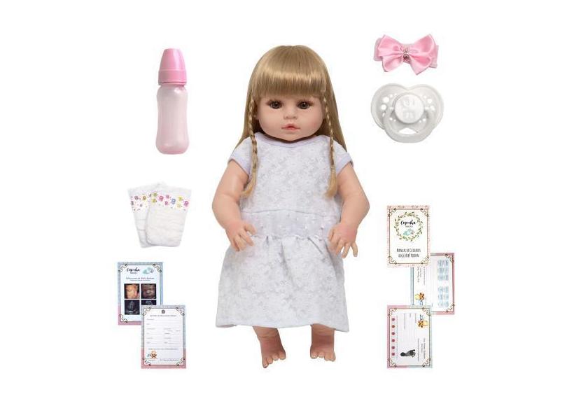 Boneca Reborn Loira Olho Castanho Vestido Branco 13 Itens - Cegonha Re