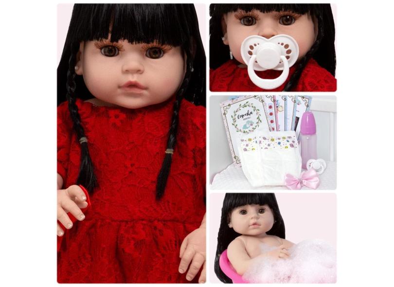 Boneca Reborn Morena Corpo de Silicone Enxoval 13 Acessórios