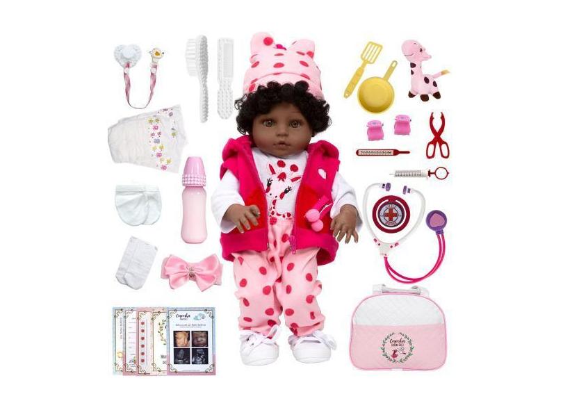 Boneca Reborn Negra Roupa Girafinha 46cm Enxoval Completo - Cegonha Re