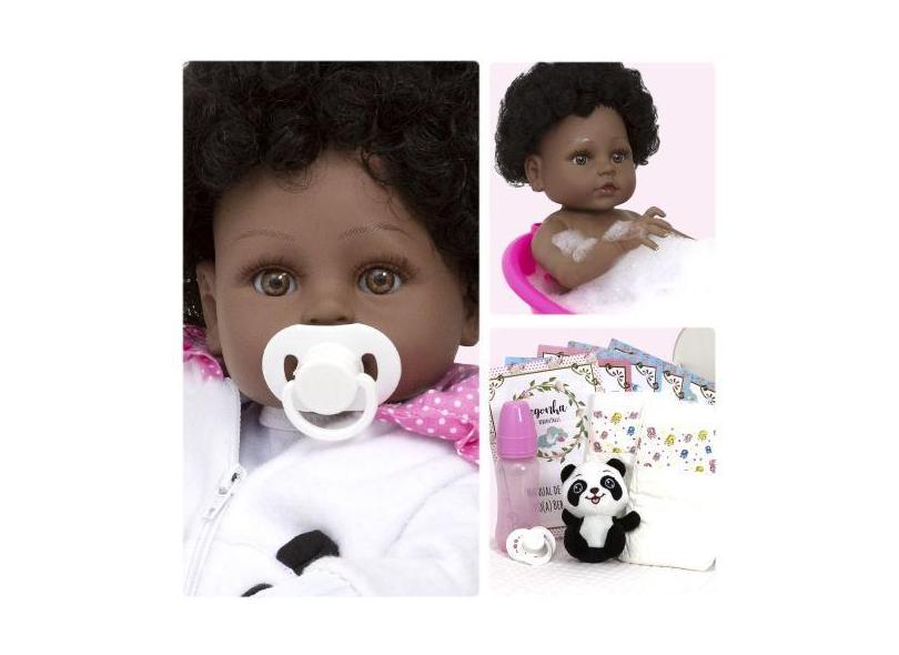 Boneca Reborn Pretinha Panda Cabelo Cacheado Corpo de Vinil - Cegonha