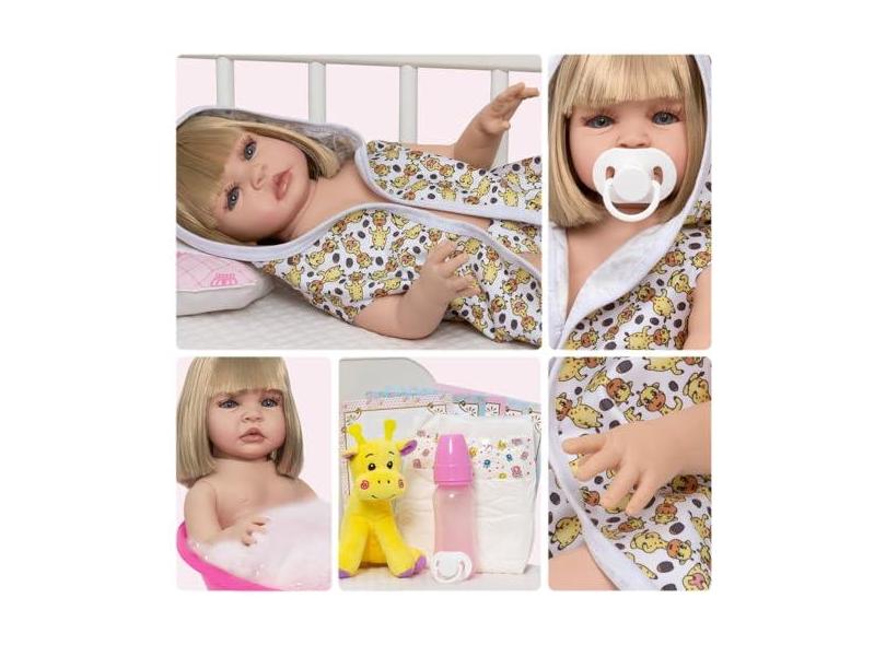 Boneca Reborn Realista Loira Girafinha Saída de Banho Itens