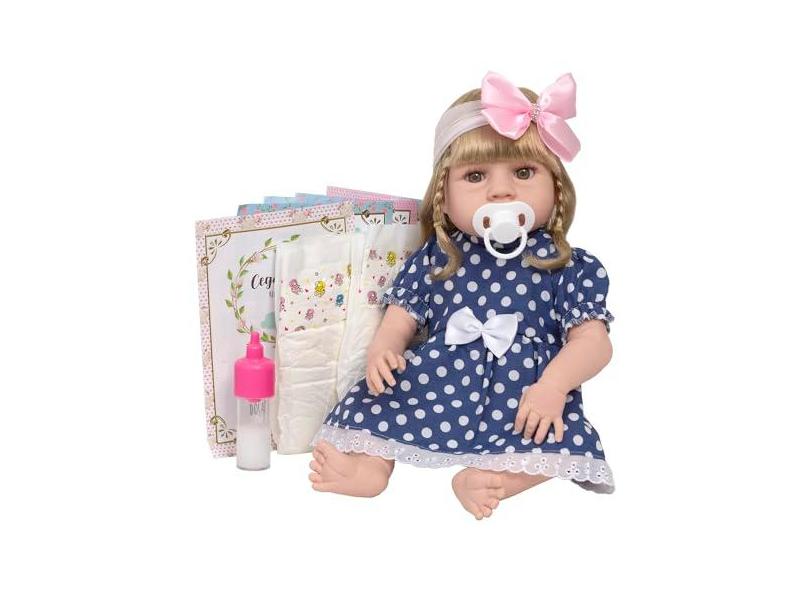 Boneca Reborn Realista Loira Vestido Bolinha Vários Itens
