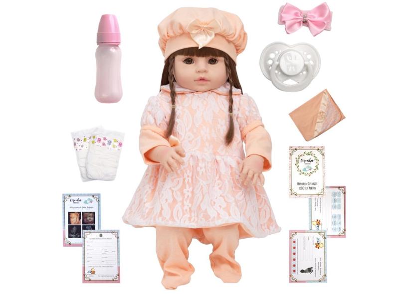 Boneca Tipo Reborn 46cm Olhos Castanhos Diversos Acessórios