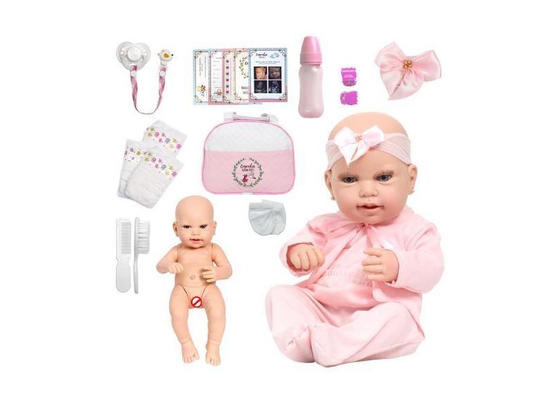 Boneca Tipo Reborn Baby Gatinha 43cm Com Bolsa Vários Itens - Cegonha