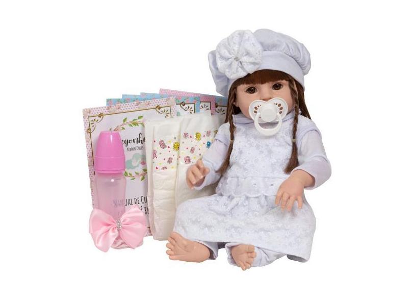 Boneca Tipo Reborn Gatinha Fofa Vestido Branco 13 Acessórios - Cegonha