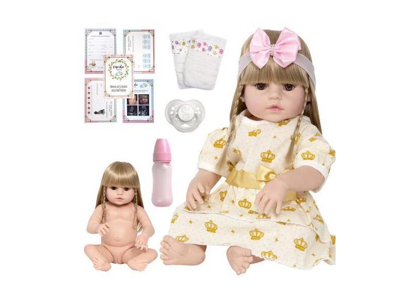 Boneca Tipo Reborn Loira Menina Vestido Dourado + Acessórios - Cegonha