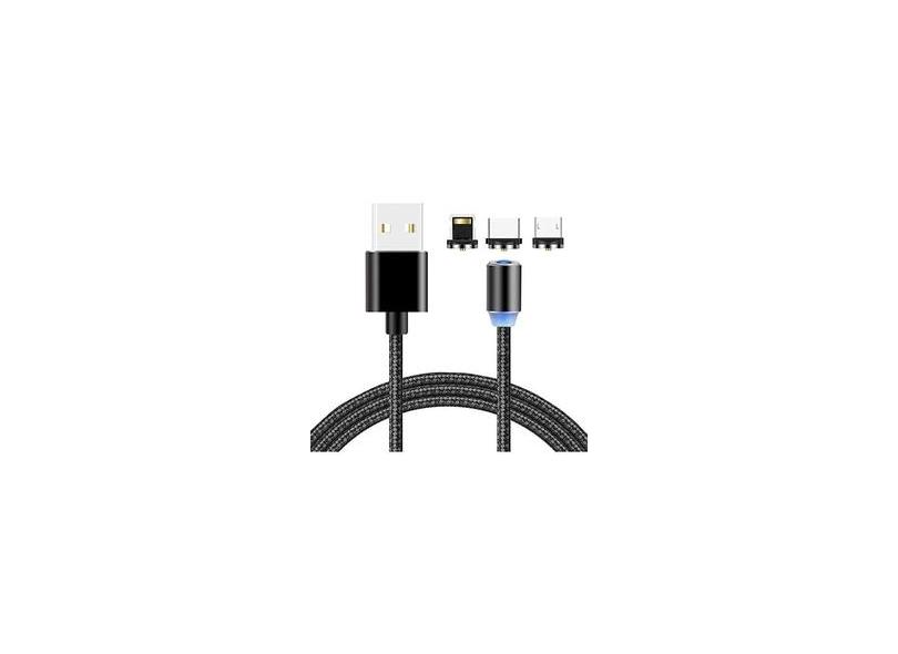 Cabo Carregador Magnético USB 2 Metros 3 Em 1 Nylon Imã Plug Tipo C, Micro USB V8 E Lightning iPhone