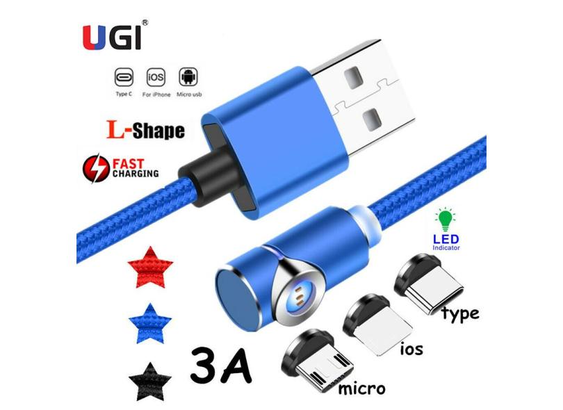 Ugi 3a magnético cabo de carregamento rápido l forma qc3.0 tipo c usb c cabo para ios telefone micro