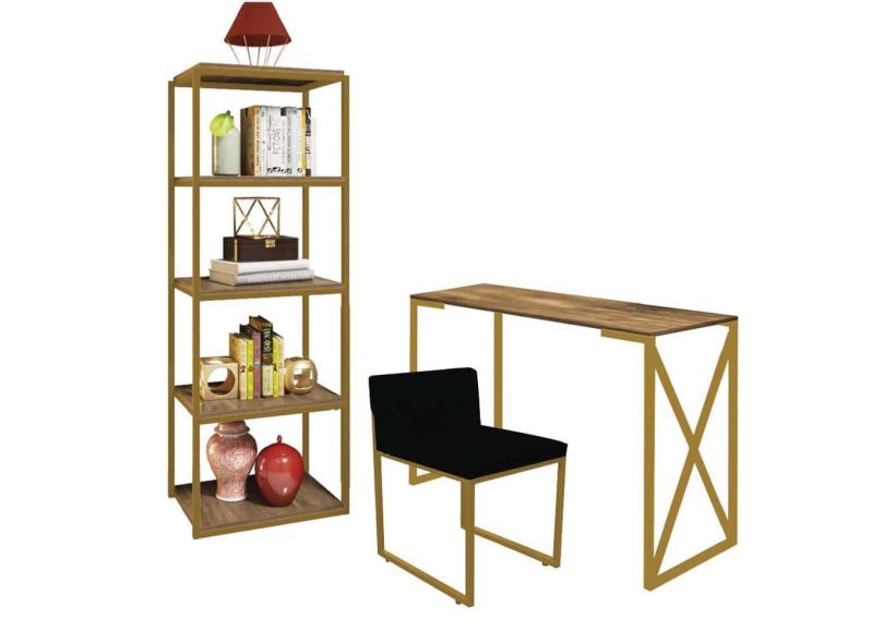 Kit Escritório Bex 1 Cadeira Suede Preto com 1 Mesa e 1 Livreiro Ferro Dourado MDF Carvalho - Ahazzo Móveis