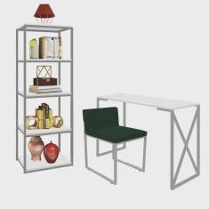 Kit Escritório Bex 1 Cadeira Suede Verde com 1 Mesa e 1 Livreiro Ferro Cinza MDF Branco - Ahazzo Móveis