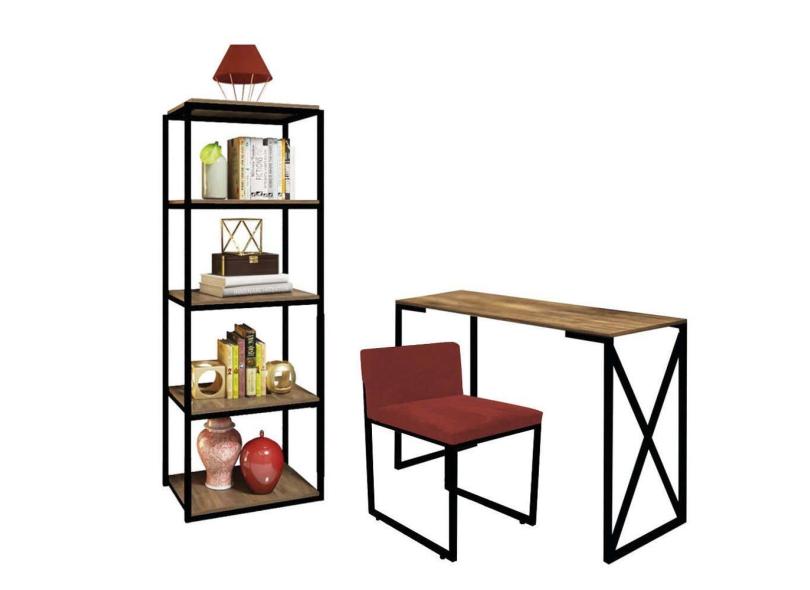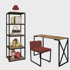Kit Escritório Bex 1 Cadeira Suede Vermelho com 1 Mesa e 1 Livreiro Ferro Preto MDF Freijó - Ahazzo Móveis