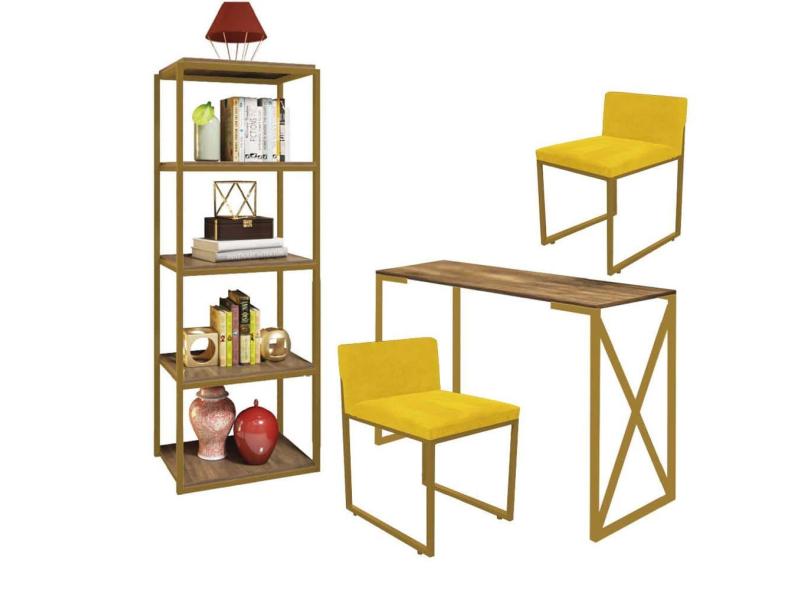 Kit Escritório Bex 2 Cadeiras Sintético Amarelo com 1 Mesa e 1 Livreiro Ferro Dourado MDF Imbuia - Ahazzo Móveis