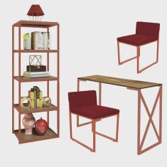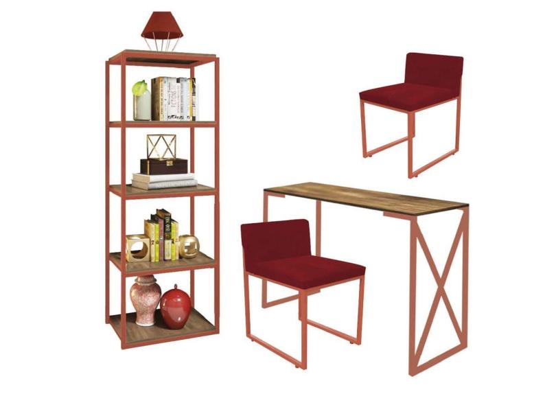Kit Escritório Bex 2 Cadeiras Sintético Vermelho com 1 Mesa e 1 Livreiro Ferro Bronze MDF Imbuia - Ahazzo Móveis