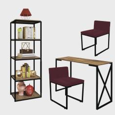 Kit Escritório Bex 2 Cadeiras Suede Bordô com 1 Mesa e 1 Livreiro Ferro Preto MDF Rústico - Ahazzo Móveis