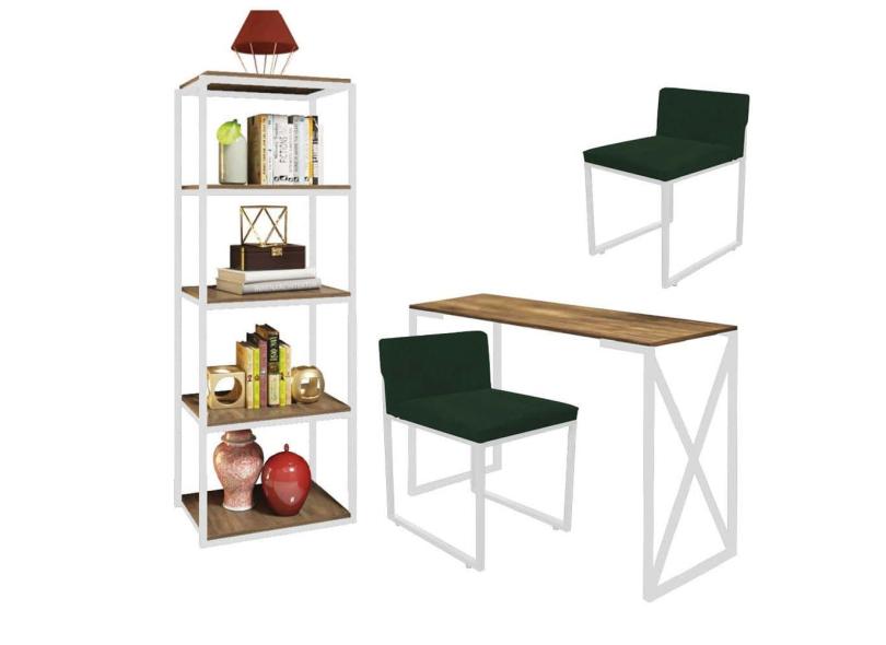 Kit Escritório Bex 2 Cadeiras Suede Verde com 1 Mesa e 1 Livreiro Ferro Branco MDF Imbuia - Ahazzo Móveis