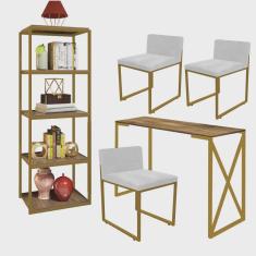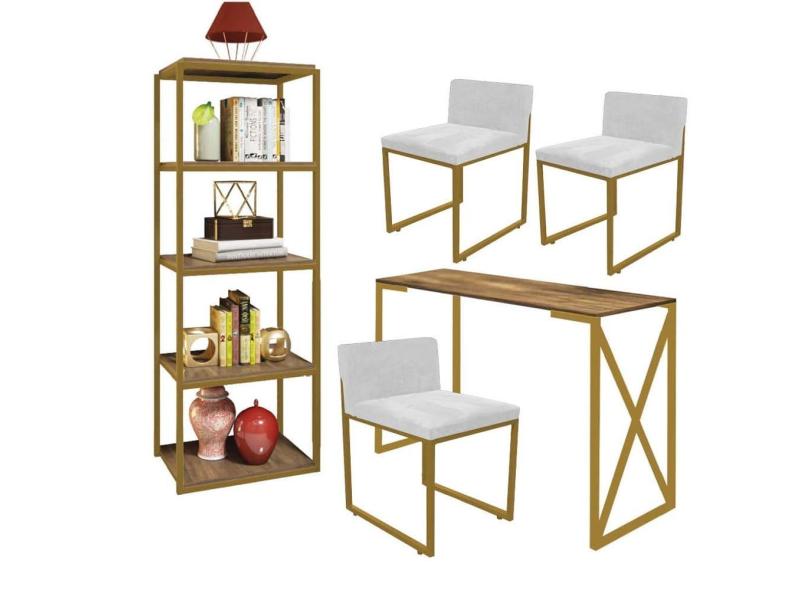 Kit Escritório Bex 3 Cadeiras Corino Branco com 1 Mesa e 1 Livreiro Ferro Dourado MDF Caramelo - Ahazzo Móveis