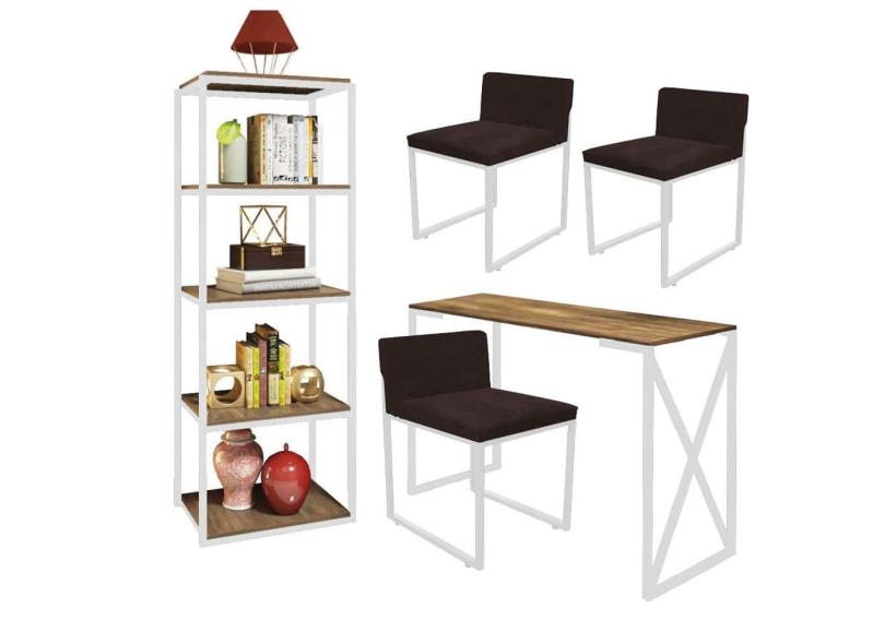 Kit Escritório Bex 3 Cadeiras Corino Marrom com 1 Mesa e 1 Livreiro Ferro Branco MDF Carvalho - Ahazzo Móveis