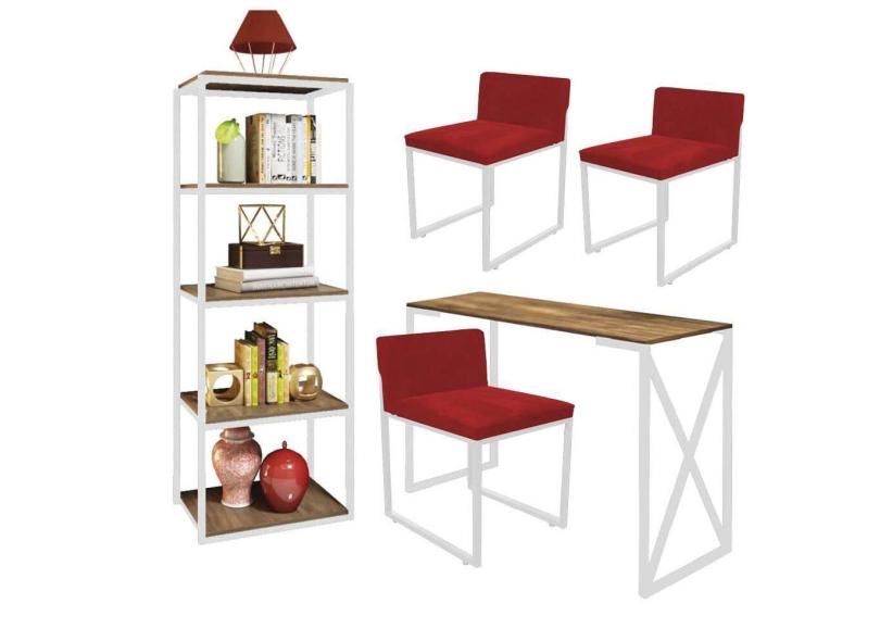 O menor preço encontrado no Brasil para Kit Escritório Bex 3 Cadeiras Corino Vermelho com 1 Mesa e 1 Livreiro Ferro Branco MDF Imbuia - Ahazzo Móveis atualmente é R$ 2.089,90.