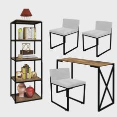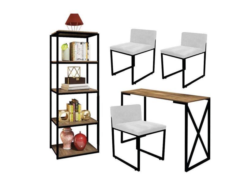 Kit Escritório Bex 3 Cadeiras Sintético Branco com 1 Mesa e 1 Livreiro Ferro Preto MDF Imbuia - Ahazzo Móveis