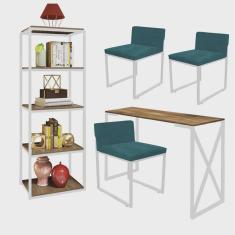 Kit Escritório Bex 3 Cadeiras Suede Azul Turquesa com 1 Mesa e 1 Livreiro Ferro Branco MDF Freijó - Ahazzo Móveis