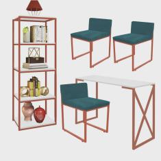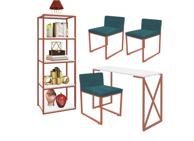O menor preço encontrado no Brasil para Kit Escritório Bex 3 Cadeiras Suede Azul Turquesa com 1 Mesa e 1 Livreiro Ferro Bronze MDF Branco - Ahazzo Móveis atualmente é R$ 1.909,90.