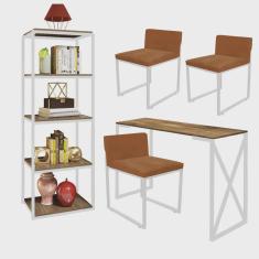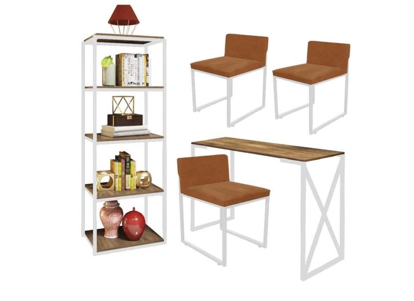 Kit Escritório Bex 3 Cadeiras Suede Terracota com 1 Mesa e 1 Livreiro Ferro Branco MDF Caramelo - Ahazzo Móveis