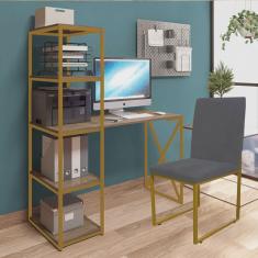 O menor preço encontrado no Brasil para Kit Escritório Mesa Max BeX 5 Prateleiras e Cadeira Stan Dourado Tampo Rústico Sintético Cinza - Ahz Móveis atualmente é R$ 1.079,90.