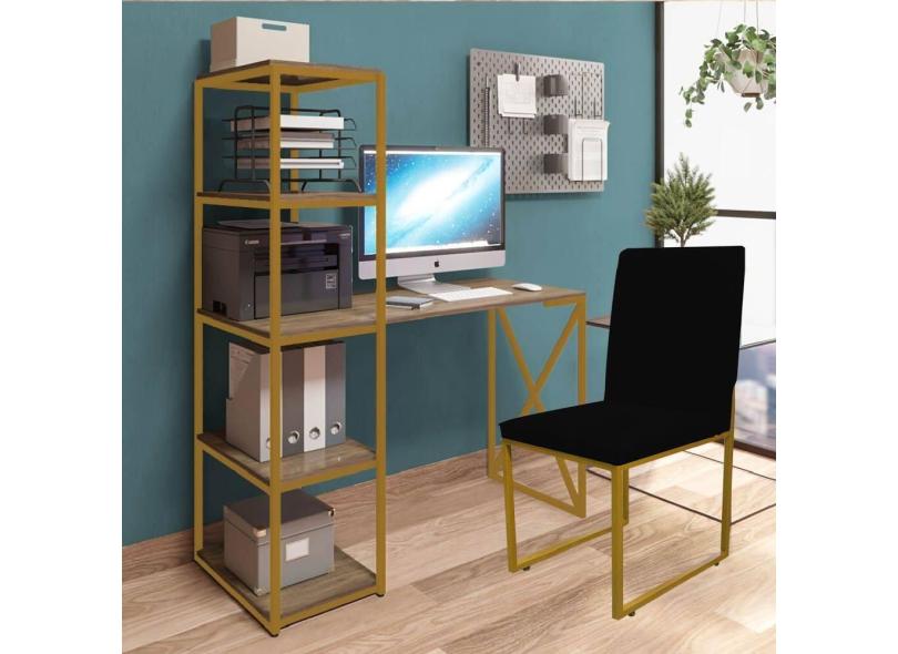 Kit Escritório Mesa Max BeX 5 Prateleiras e Cadeira Stan Dourado Tampo Rústico Sintético Preto - Ahz Móveis