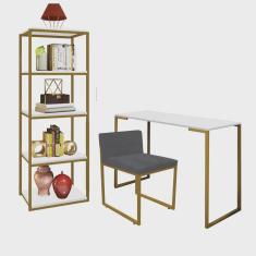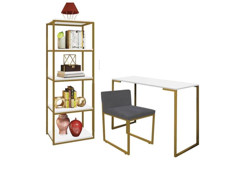 O menor preço encontrado no Brasil para Kit Escritório Ravi 1 Cadeira Suede Cinza com 1 Mesa e 1 Livreiro Ferro Dourado MDF Branco - Ahazzo Móveis atualmente é R$ 1.189,90.