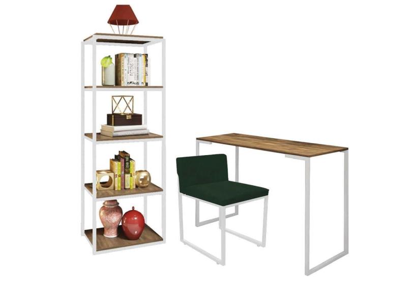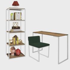 Kit Escritório Ravi 1 Cadeira Suede Verde com 1 Mesa e 1 Livreiro Ferro Branco MDF Malbec - Ahazzo Móveis