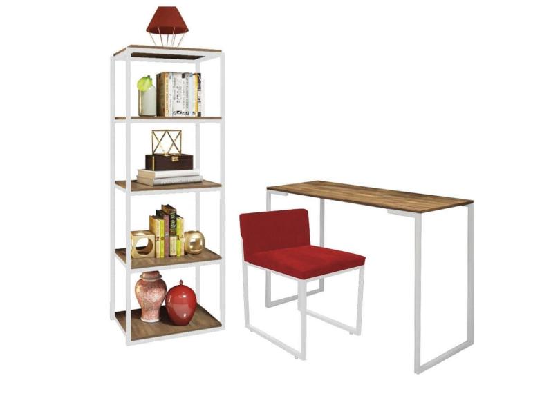 O menor preço encontrado no Brasil para Kit Escritório Ravi 1 Cadeira Suede Vermelho com 1 Mesa e 1 Livreiro Ferro Branco MDF Rústico - Ahazzo Móveis atualmente é R$ 1.369,90.