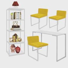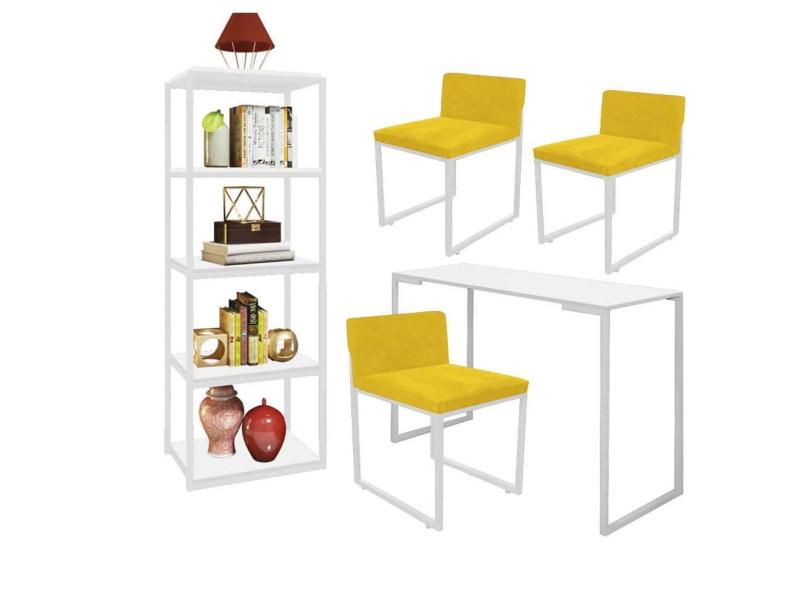 O menor preço encontrado no Brasil para Kit Escritório Ravi 3 Cadeiras Suede Amarelo com 1 Mesa e 1 Livreiro Ferro Branco MDF Branco - Ahazzo Móveis atualmente é R$ 1.869,90.