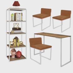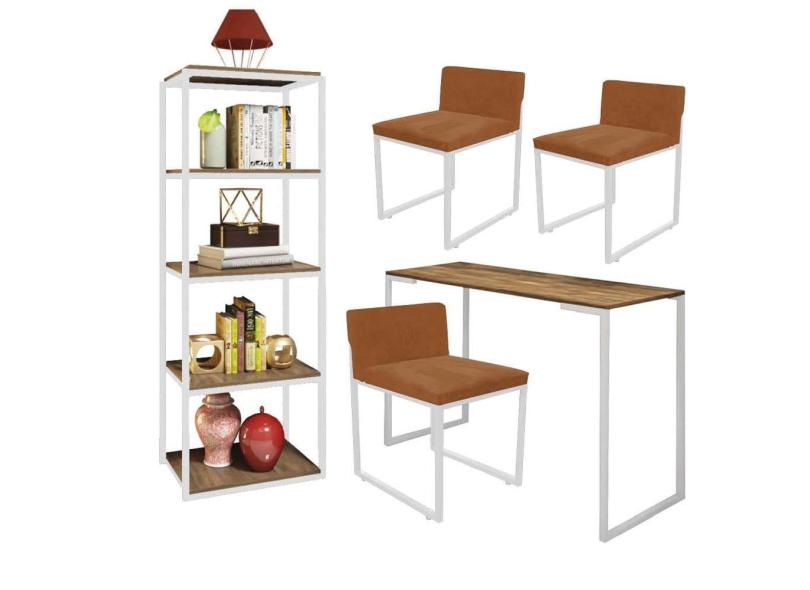 O menor preço encontrado no Brasil para Kit Escritório Ravi 3 Cadeiras Suede Terracota com 1 Mesa e 1 Livreiro Ferro Branco MDF Rústico - Ahazzo Móveis atualmente é R$ 2.049,90.