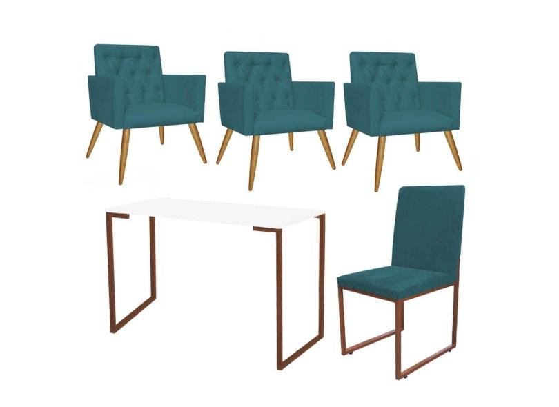 O menor preço encontrado no Brasil para Kit Escritório Stan 3 Poltronas Capitonê com Cadeira e Mesa Industrial Branco Bronze Suede Azul Turquesa - Ahz Móveis atualmente é R$ 2.079,90.