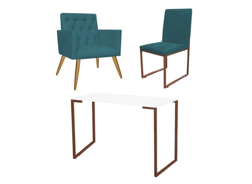 Kit Escritório Stan Poltrona Capitonê com Cadeira e Mesa Industrial Branco Bronze Suede Azul Turquesa - Ahz Móveis