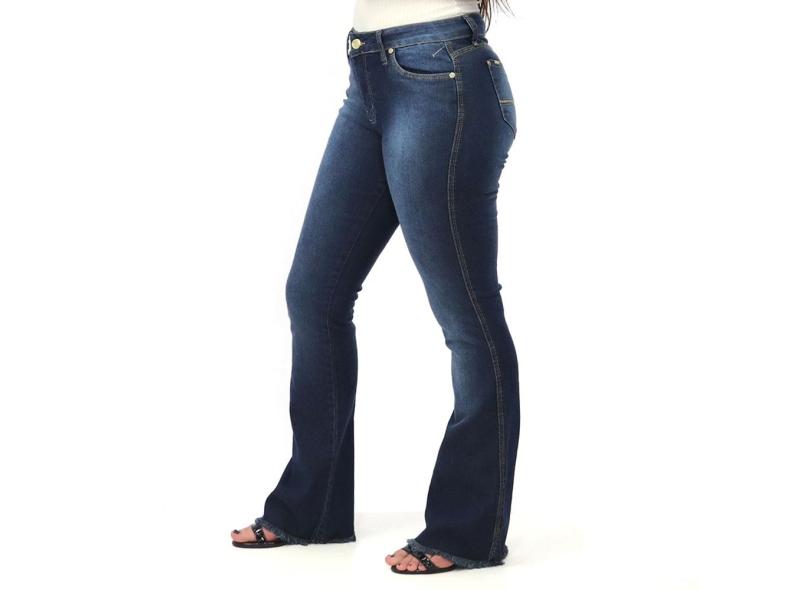 Calça Jeans Feminina Flare Lycra Cintura Alta Barra Desfiada