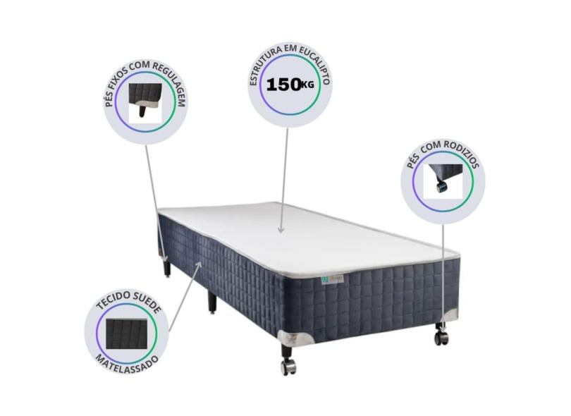 Base Box Castor Solteiro Silver Star Suede Cinza Matelassado 88X188x40 - Cama Reforçada Até 150Kg
