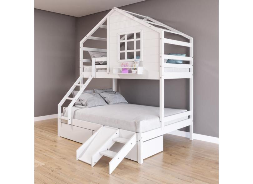 O menor preço encontrado no Brasil para Beliche Casinha com Janela Casal/Solteiro com 02 Gavetas e Kit Escada/Escorregador Madeira Maciça Branco Housin atualmente é R$ 2.886,53.