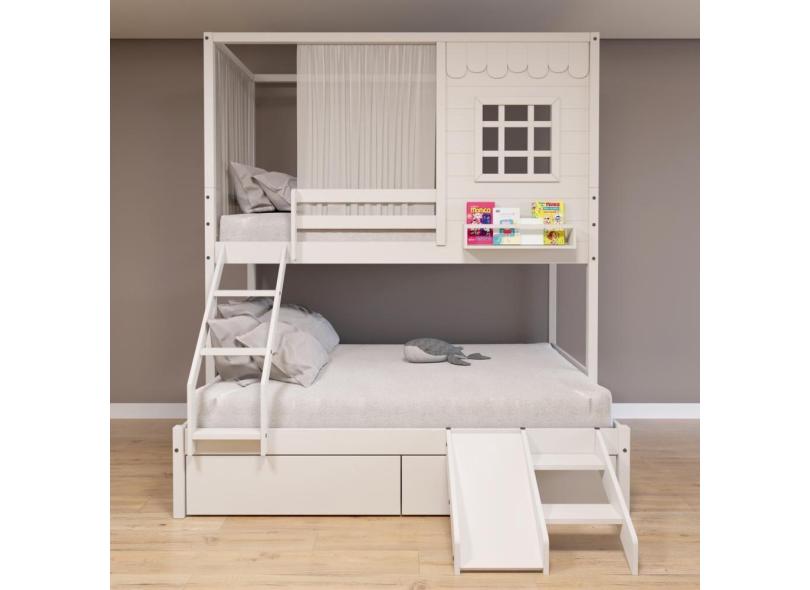 Beliche Casinha Reta Casal/ Solteiro Com 02 Gavetas Escorregador E Cortina Madeira Maciça Branco Housin