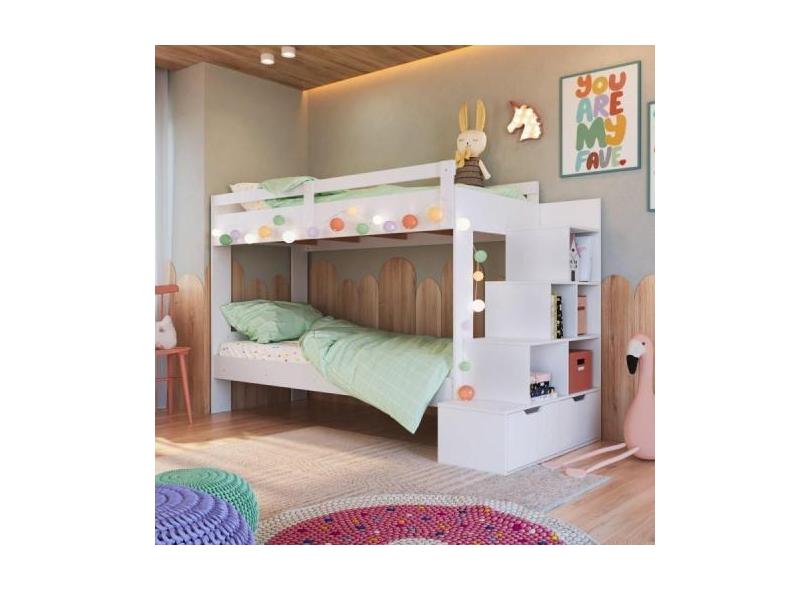 Beliche Infantil com Escada Nichos 2 Gavetas 1 Colchões Inclusos Branc