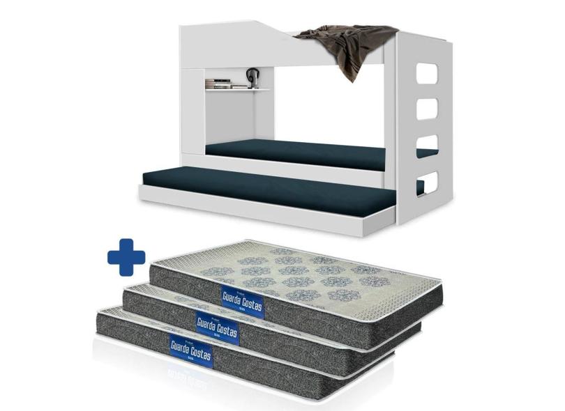 Beliche Solteiro Com Cama Auxiliar 100% MDF Branco Hibisco Incabrás Com 3 Colchões Probel D20