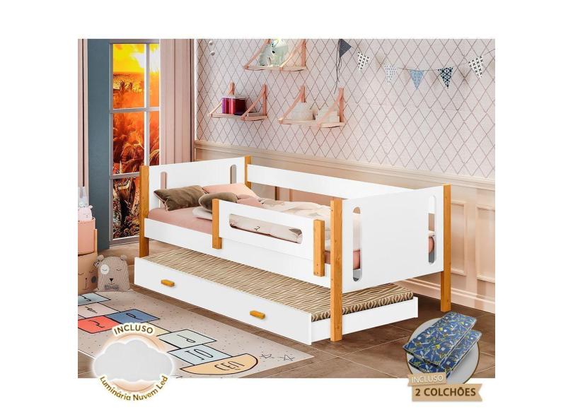 Bicama Infantil Com Grade De Proteção E Colchões Mirela Branca/Mel + Luminária Led - Branco