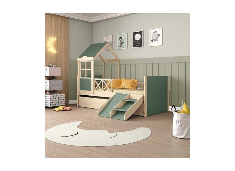 Bicama Solteiro Infantil Garden com Telhado Plus e Kit Escadinha Casatema Verde/Natural