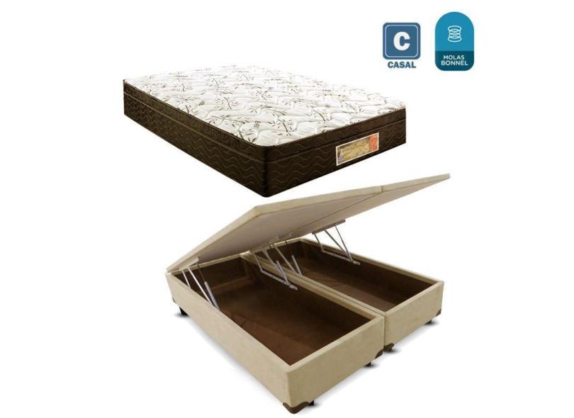 Cama Box casal com baú bege bi partido suede + Colchão Molas Bonnel 1,38 x 1,88 x 24 cm