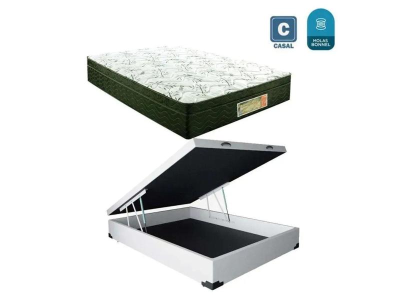 O menor preço encontrado no Brasil para Cama Box casal com baú branca + Colchão Molas bonnel 1,38 x 1,88 x 20 cm atualmente é R$ 1.278,00.