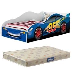 Cama Carro Infantil Mcqueen Azul C/ Colchão Juvenil 100% Mdf Quarto -