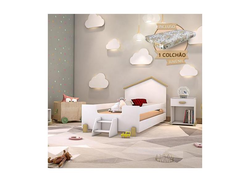 Cama de Criança Infantil com Colchão e Escadinha Juvenil Ayla - Branca