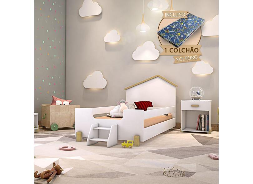 Cama De Criança Infantil Com Colchão E Escadinha Solteiro Ayla - Branca E Natural Branco