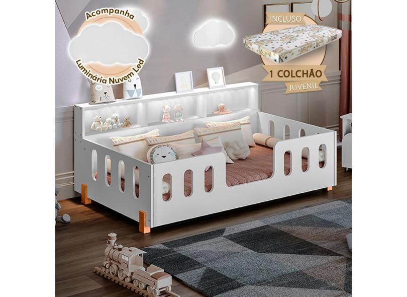 Cama de Criança Infantil Montessoriana com Colchão Juvenil Led e Nicho Nina Branca Luminária Led