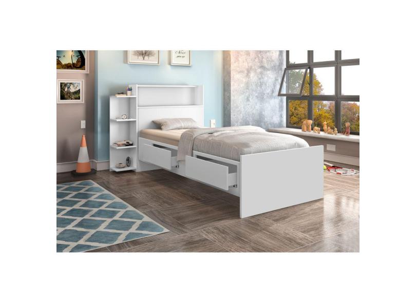 O menor preço encontrado no Brasil para cama estilo moderna tamanho solteira com gaveta e prateleira lateral branca atualmente é R$ 590,90.